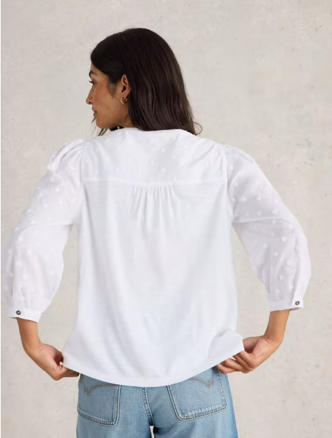 Le haut de la blouse et les manches sont illustrés d’un joli motif de pois brodés. Le reste de la blouse est en jersey de coton bio blanc uni, ce qui lui confère beaucoup de douceur et de fluidité.