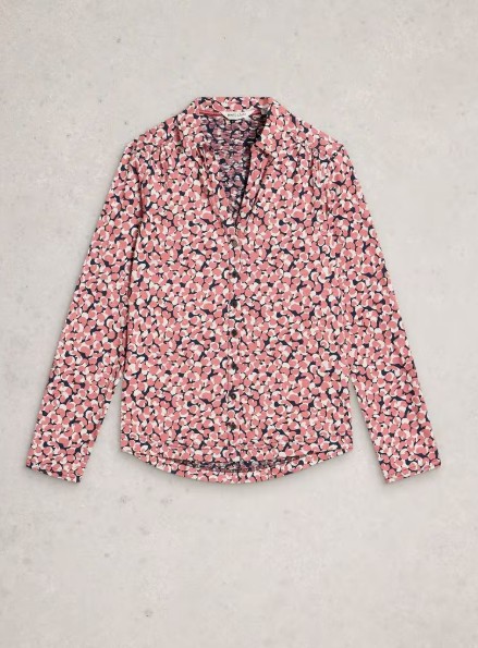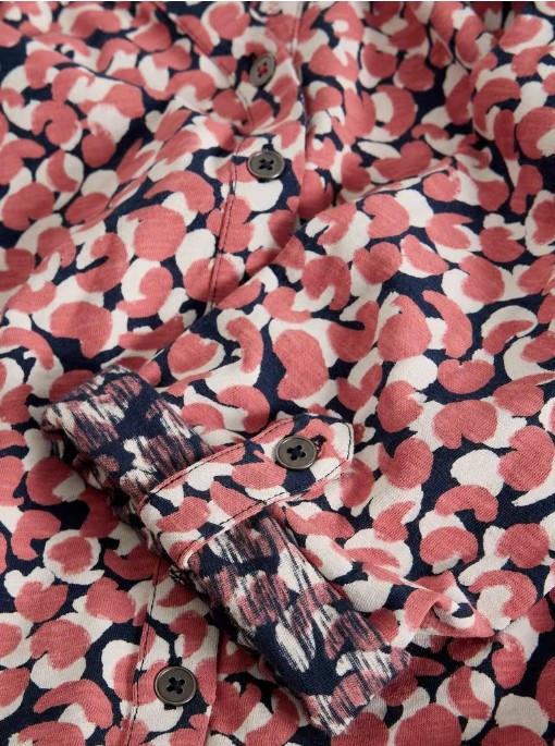 Une chemise en jersey très confortable dans un très bel imprimé qui mélange les couleurs rose, bleu marine et blanche.