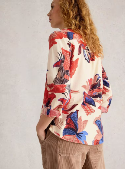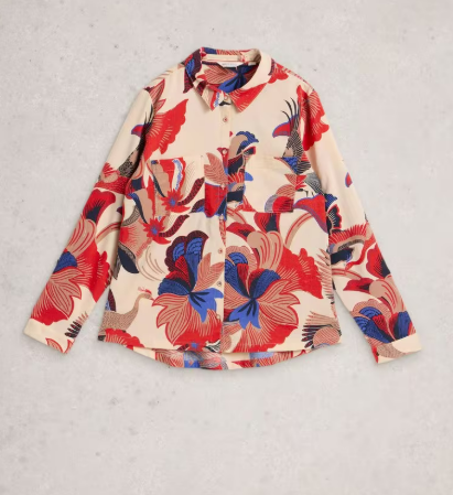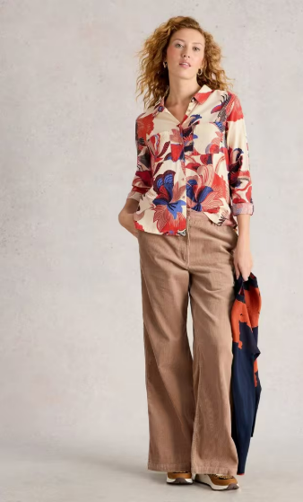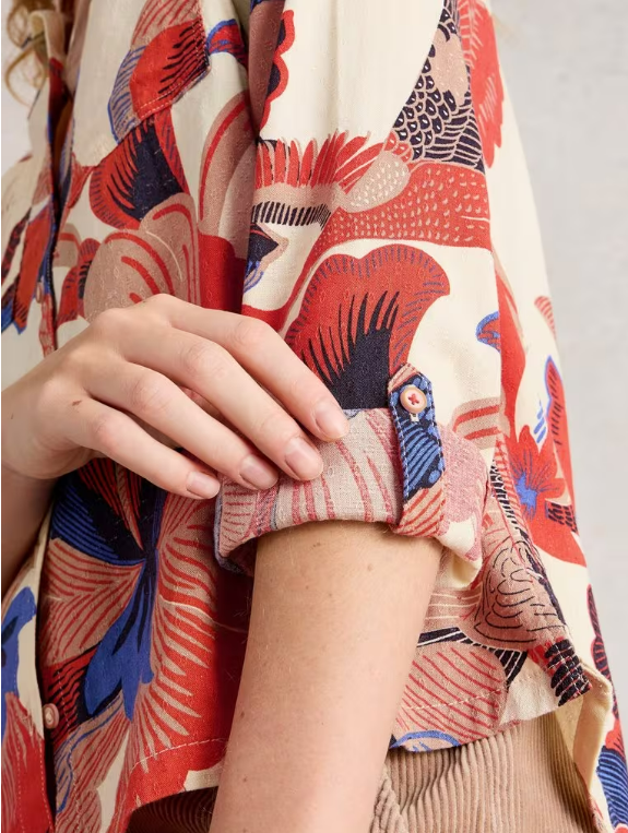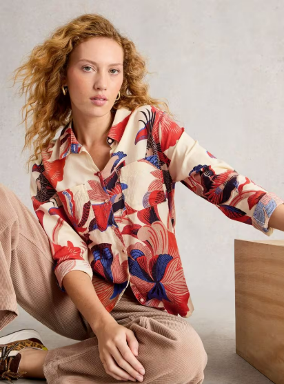 Chemise iconique de chez White Stuff qui revient cette année dans un bel imprimé tissé floral, dans les tons orange, ivoire et bleu.