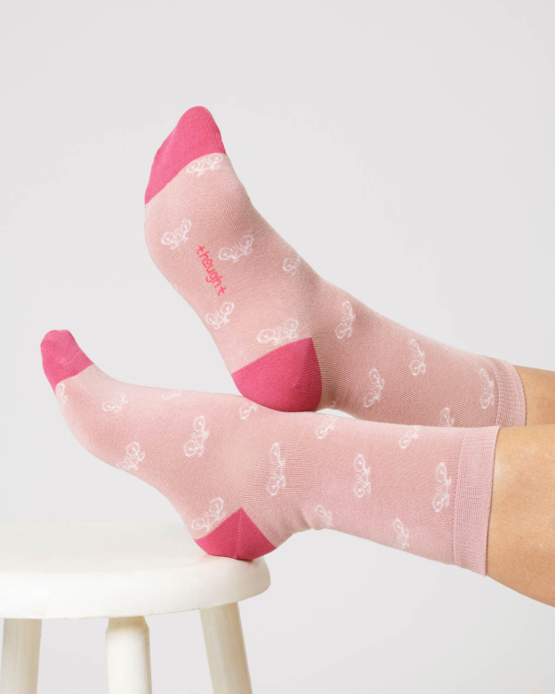 Ces chaussettes en bambou sont présentées dans un joli imprimé ludique de petits vélos blancs sur fond vieux rose.