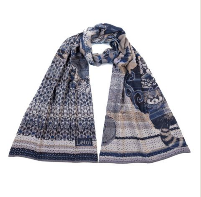Une très belle étole coton bio dans un imprimé bleu denim illustré d’un joli panda.