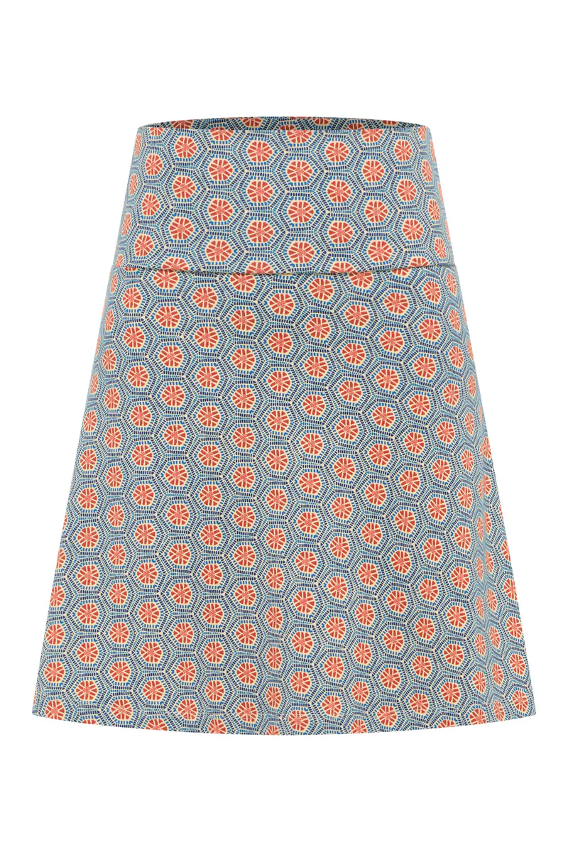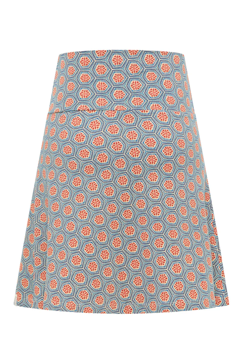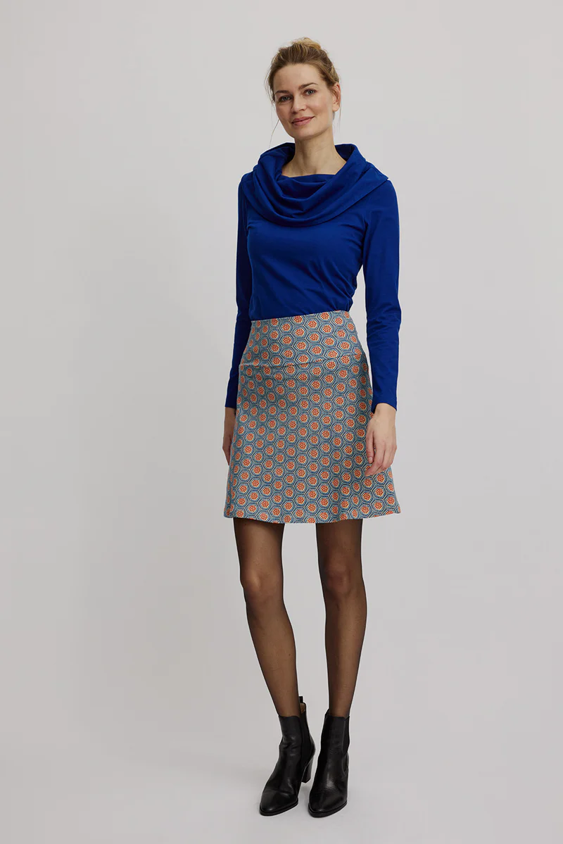 Cette jolie mini-jupe couleur bleue aux motifs géométriques orange, est un classique de Tranquillo.