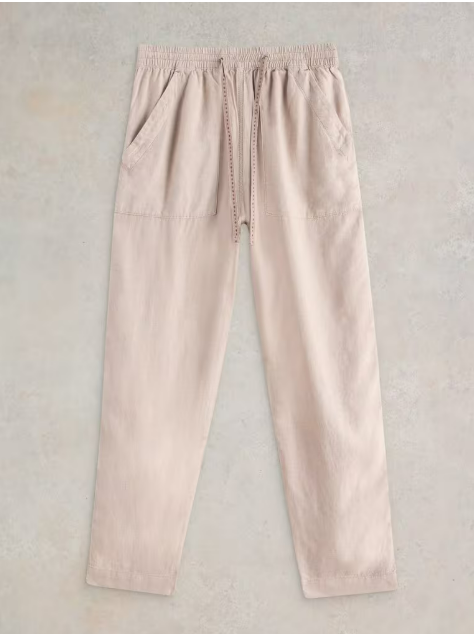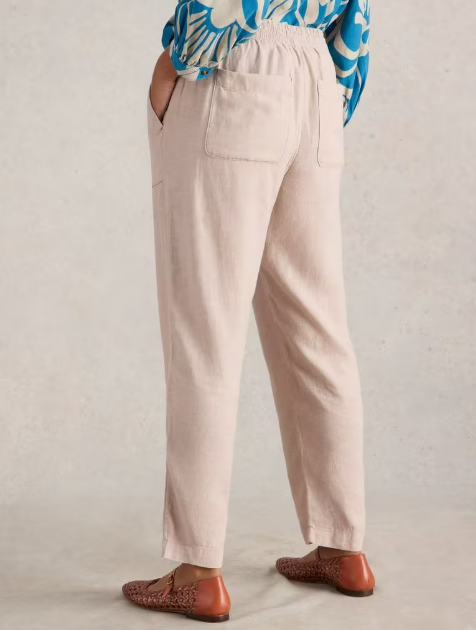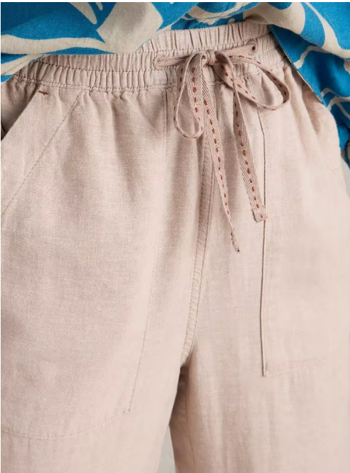 Pantalon en lin mélangé dans une couleur lin naturel, longueur cheville, avec lien à la taille.