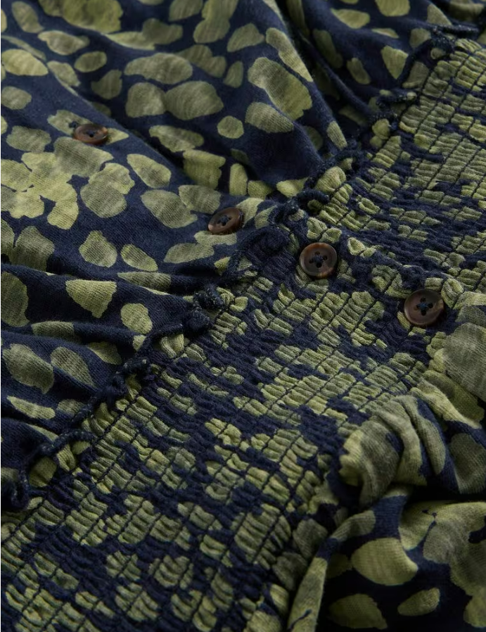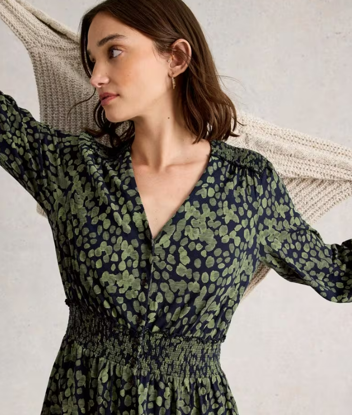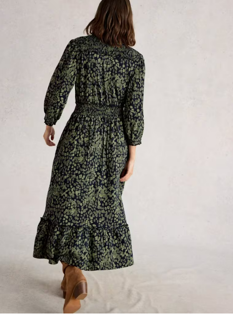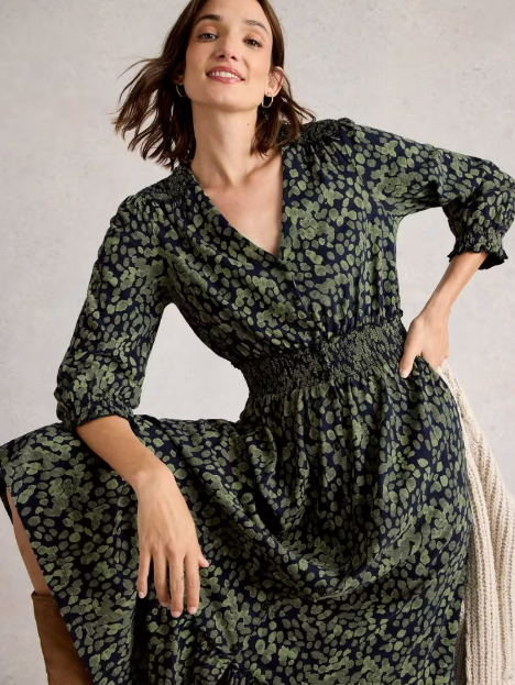 On adore cette jolie robe longue très stylée, dans un imprimé automnal vert foncé. Elle invite au mouvement par sa souplesse !