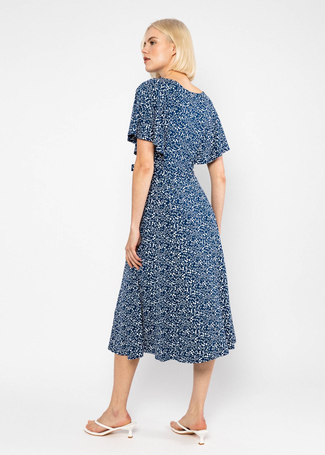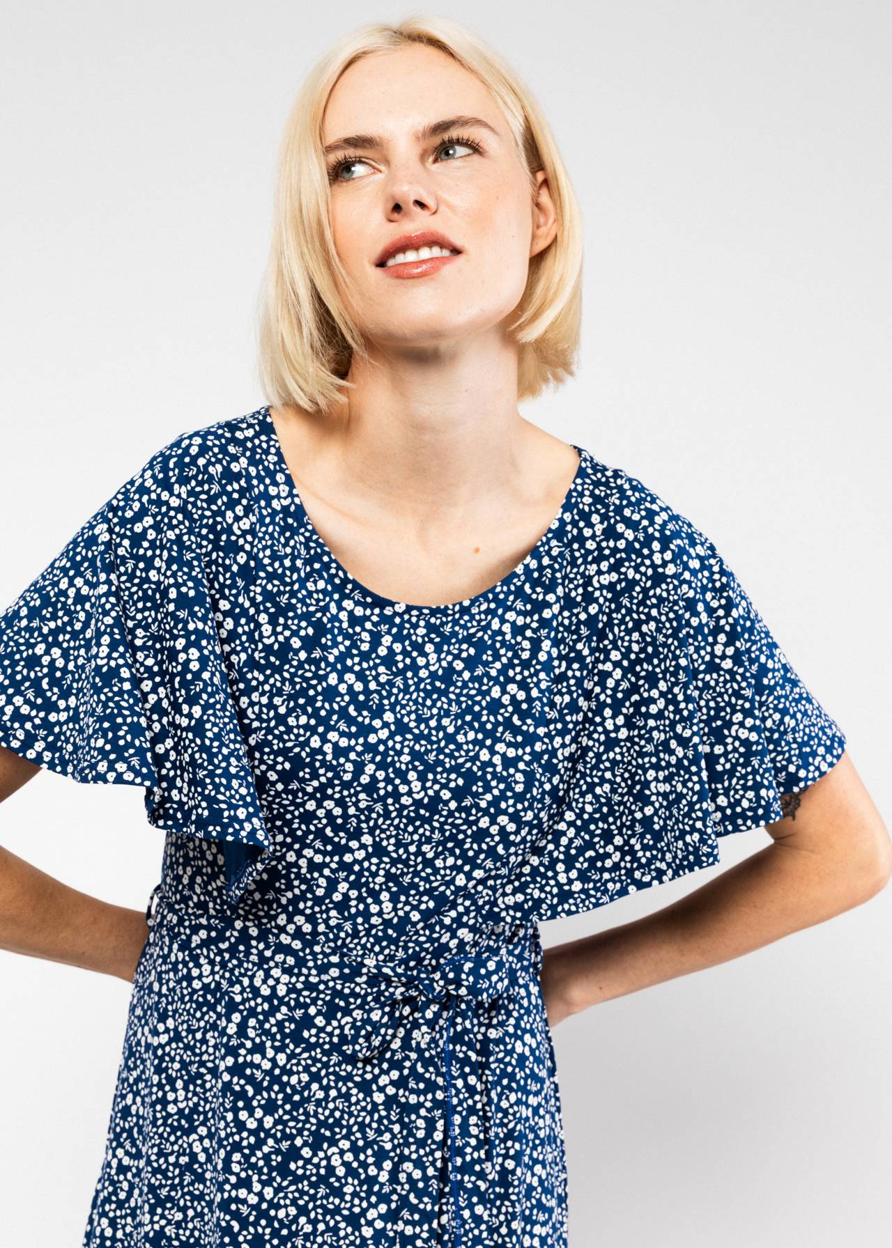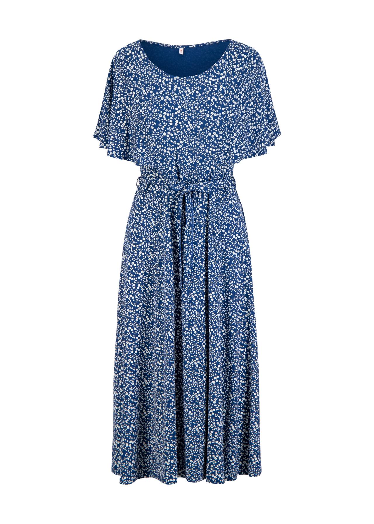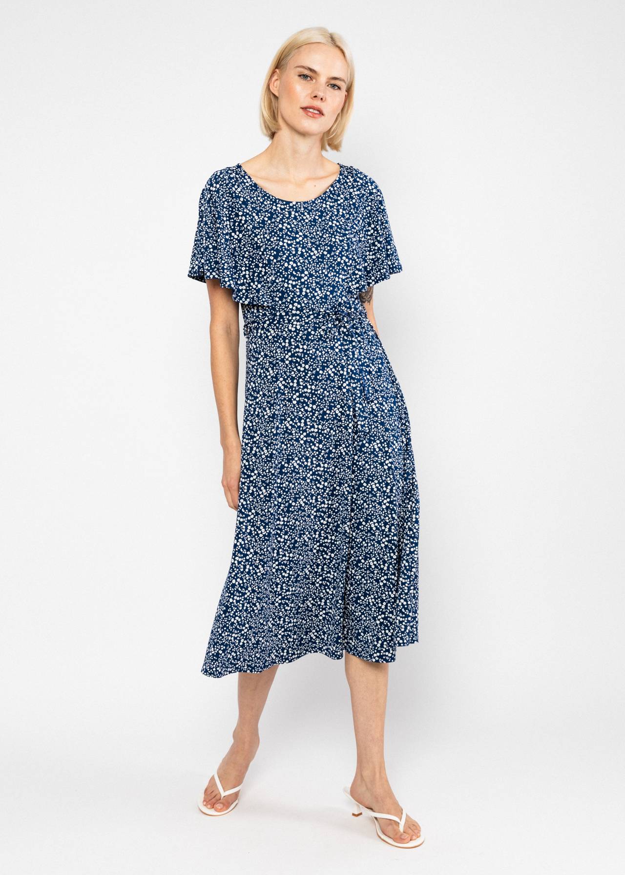 Elle vous séduira par son imprimé botanique éclatant et son jersey de viscose LENZING™ ECOVERO™ au drapé souple. Sa coupe midi décontractée épouse élégamment les formes, tandis que son encolure ronde et ses délicates manches papillon lui confèrent une touche féminine.