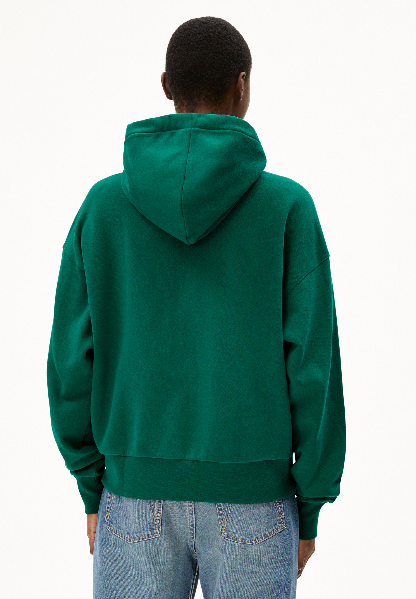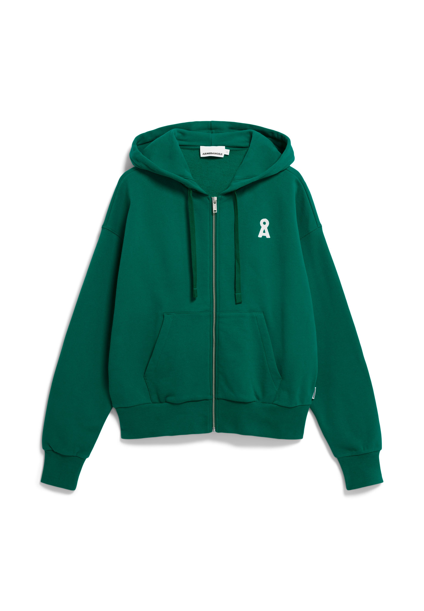 Sweat zippé à capuche tout douillet, 100 % coton bio, disponible dans une belle couleur vert émeraude flashy.