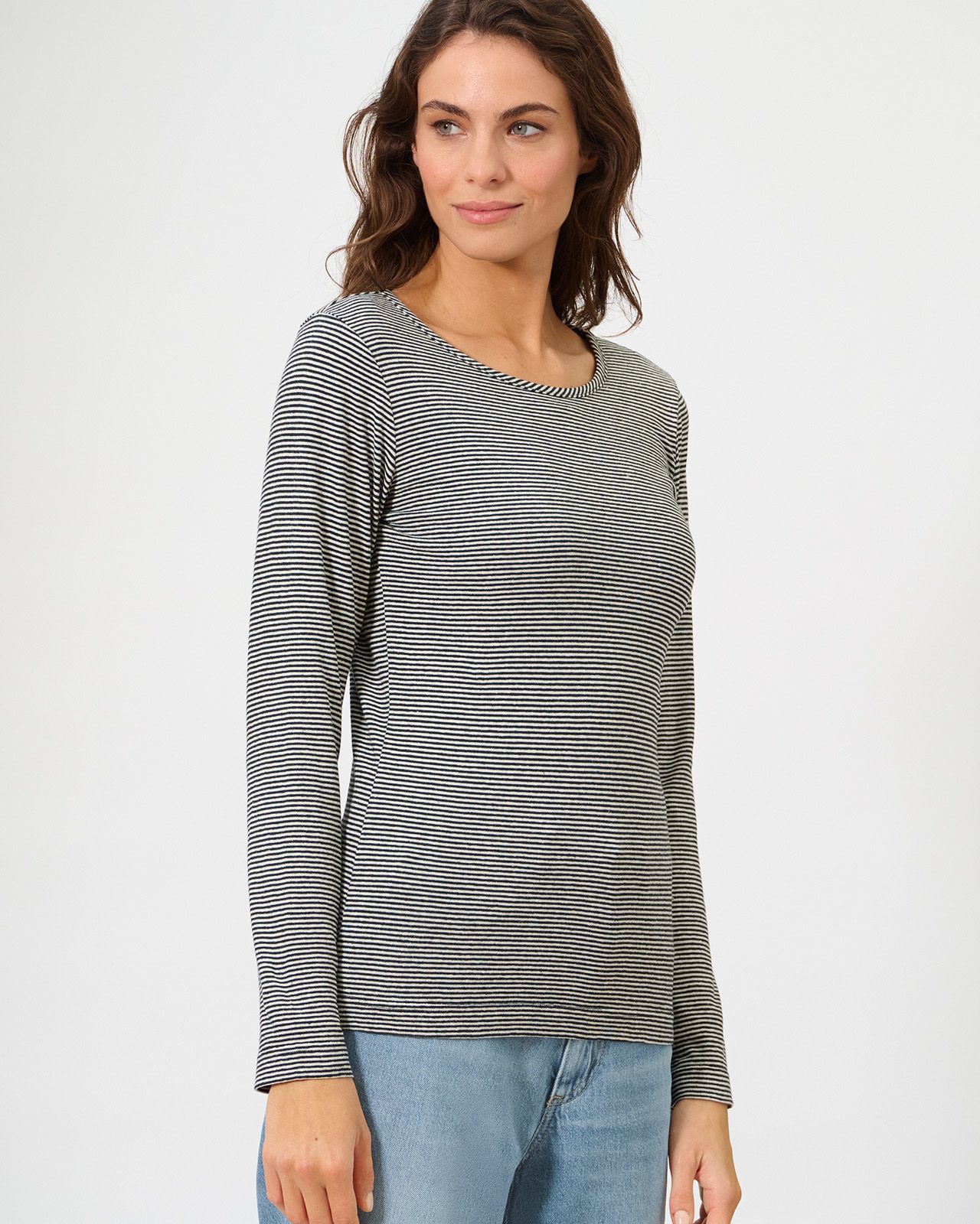 Hempage vous propose ce beau t-shirt à manches longues aux rayures joyeuses et aux couleurs harmonieusement contrastées.