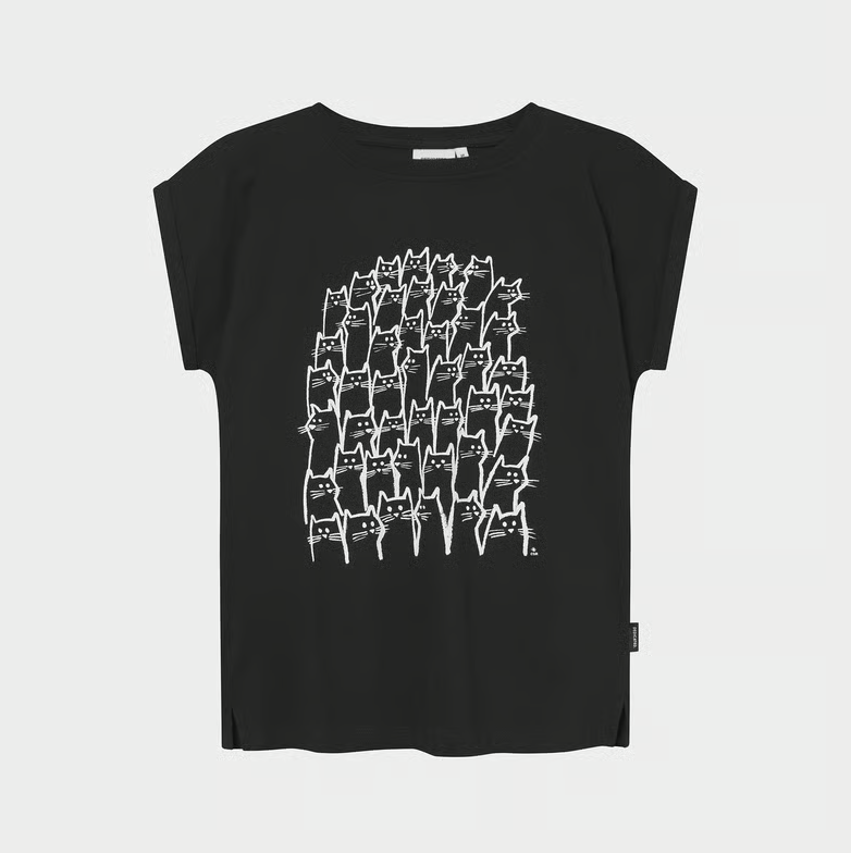 T-shirt ajusté pour femme, manches courtes et retroussées, illustré d’un joli motif ludique d’une foule de chats.