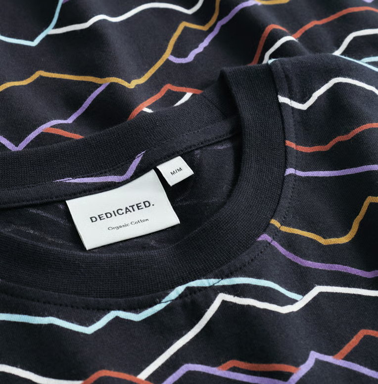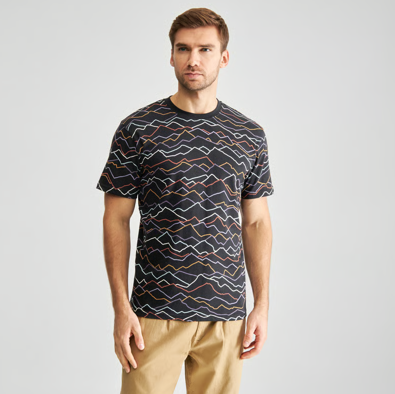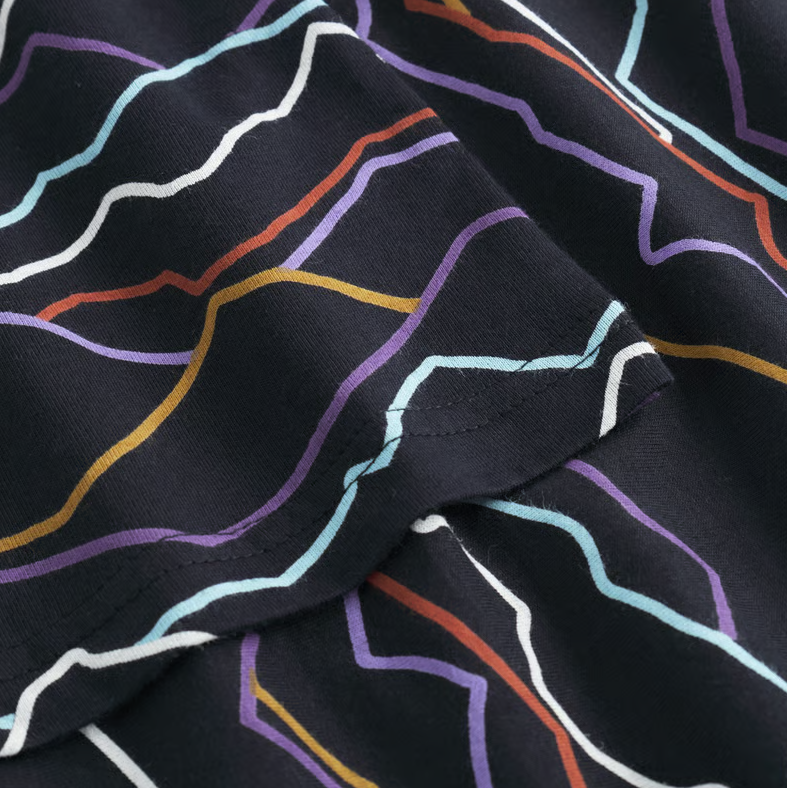 T-shirt noir, ras du cou, illustré par des courbes de montagnes colorées.
