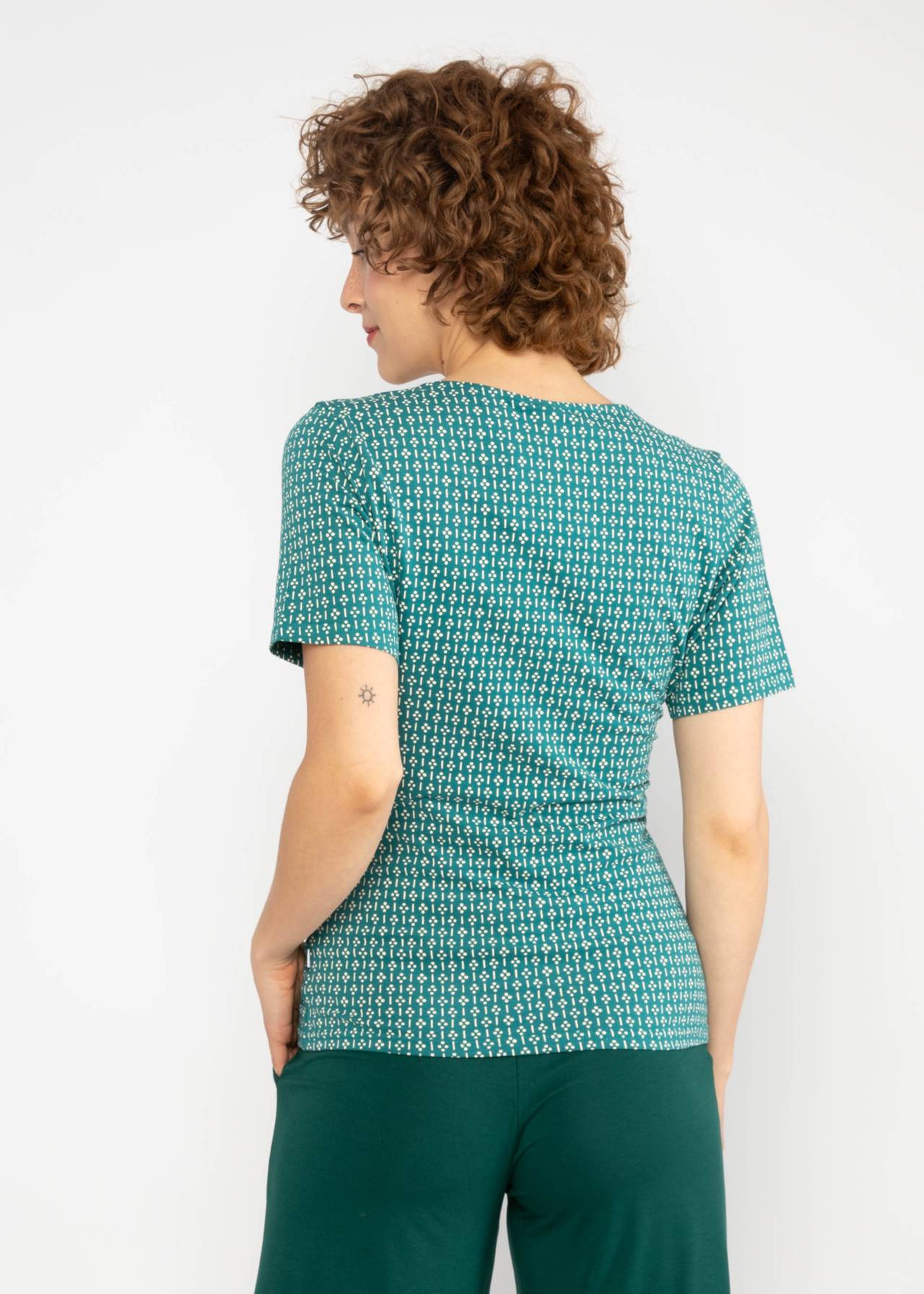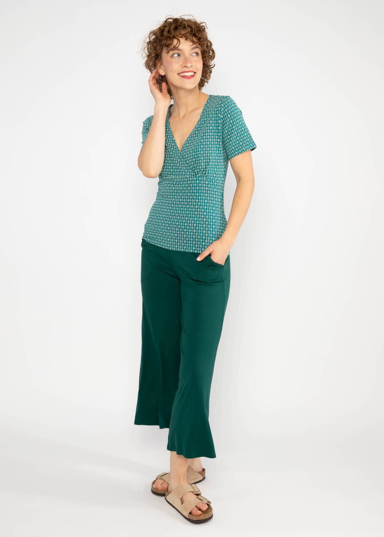 Un haut d’été féminin en jersey souple, confectionné à partir d’un coton particulièrement respectueux de l’environnement, issu d’une culture biologique certifiée. Avec son décolleté en V effet cache-cœur, ce haut moulant est un incontournable confortable au quotidien.